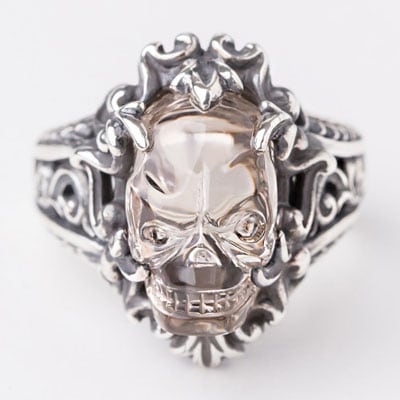 手彫りスカル水晶のリング。すべて手作業によるスカル彫りは1点1点丁寧に仕上げられており、スモーキークォーツの素材から製作されています。台座はどちらもSilver925製。