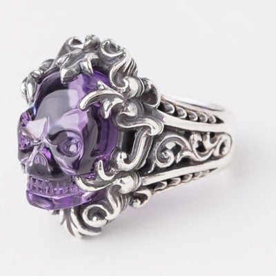 手彫りスカル水晶のリング。すべて手作業によるスカル彫りは1点1点丁寧に仕上げられており、アメジストの素材から製作されています。台座はどちらもSilver925製。 -