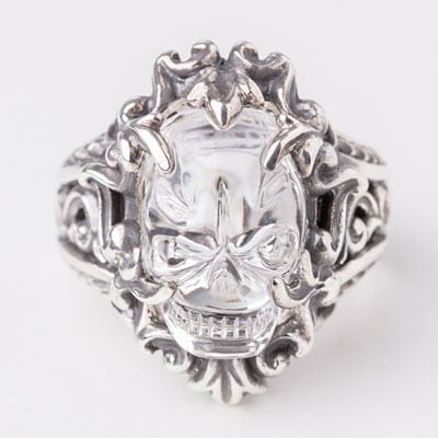 手彫りスカル水晶のリング。すべて手作業によるスカル彫りは1点1点丁寧に仕上げられており、クリア水晶の素材から製作されています。台座はどちらもSilver925製。 -